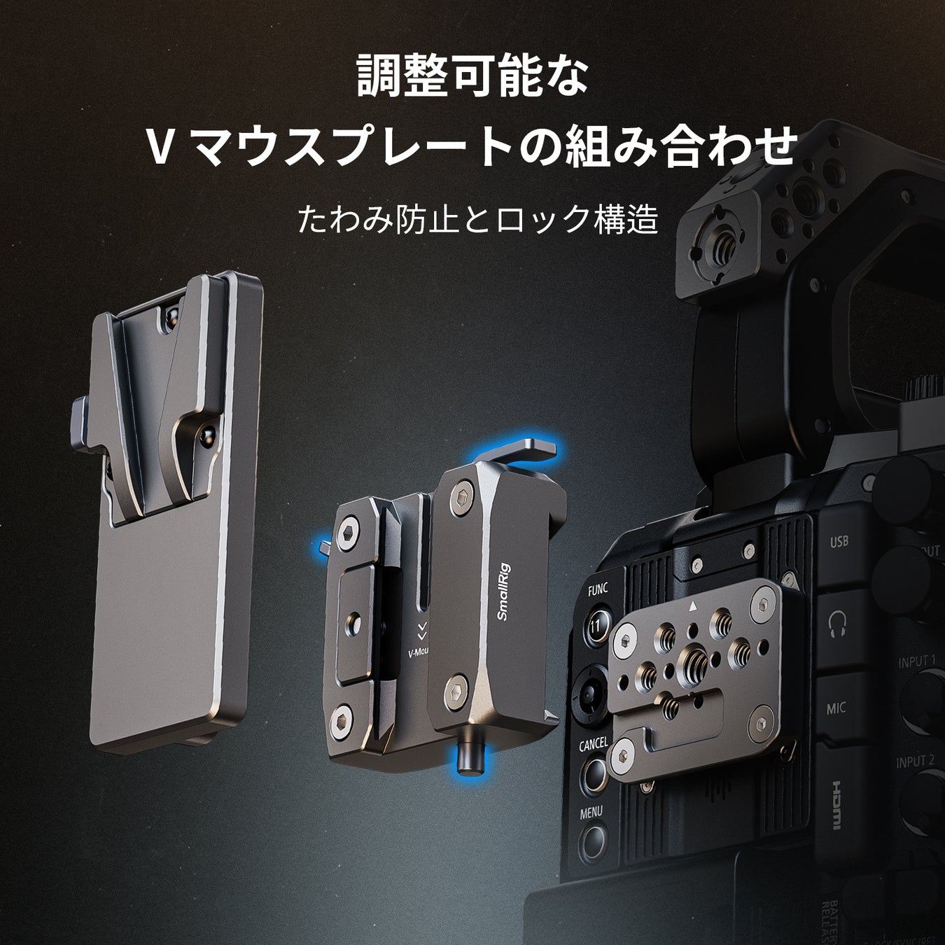 調整可能なVマウントプレートキットはチーズバックプレート、バックプレート、Vマウントプレートの3つのパートで構成されております。チーズバックプレートは1/4"-20 ネジ穴、ARRI 3/8"-16 位置決め穴、1/4"-20 位置決め穴が統合されており、Vマウントプレート、マジックアーム、モニターアダプターなどを取り付けることができます。バックプレートとVマウントプレートはそれぞれ左右と上下にスライドでき、さまざまなサイズのバッテリーに対応できます。