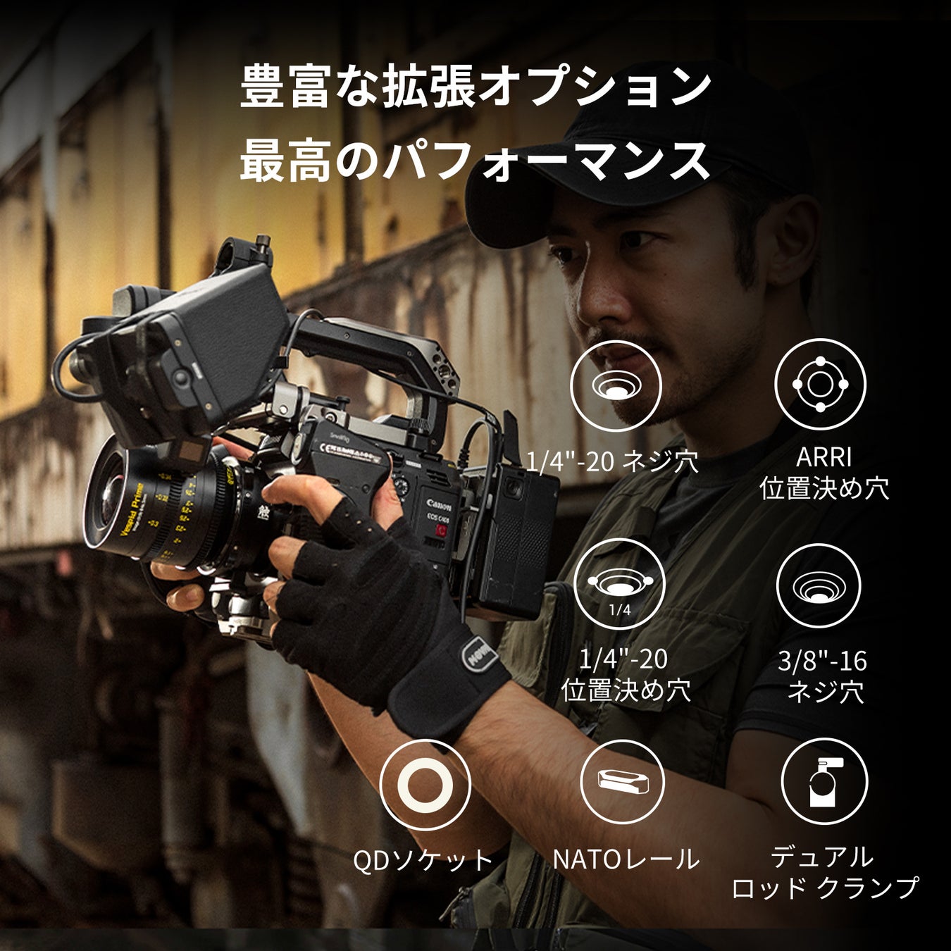 1/4"-20 ネジ穴、ARRI位置決め穴、1/4"-20 位置決め穴、3/8"-16 ネジ穴、QDソケット、デュアルロッドクランプやNATOレールなど豊富な拡張オプションを提供します。