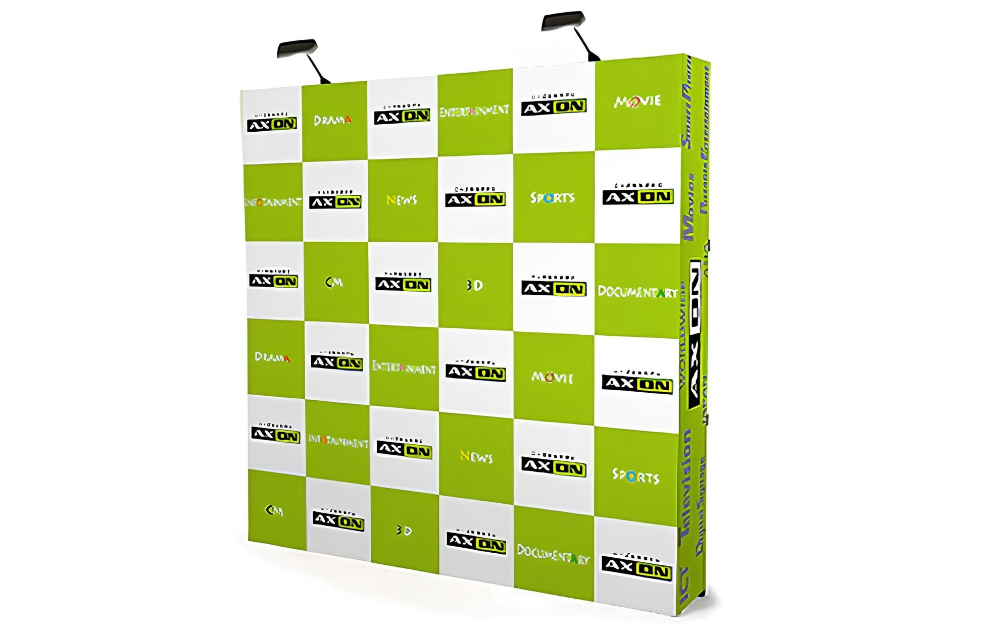 折りたたみ式の本体フレームを広げてスクリーン部分を取り付けるだけで完成する大型ディスプレイです。企業ロゴや製品情報を効果的にアピールできるので、展示会やイベント、ショールーム、記者会見などのバックパネルとして多くのシーンで使用されています。
