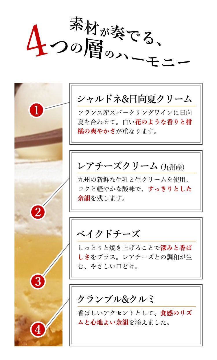 九州産クリームチーズのレアチーズとベイクドチーズ、クランブル&クルミを重ね、その上に フランス産シャルドネ(香りづけ)と宮崎県産日向夏のクリーム を重ねた4層仕立てです。