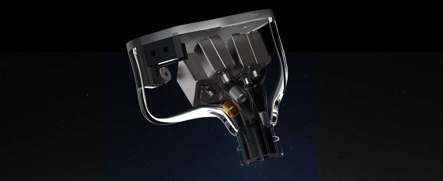 精巧に作られた眩いボディデザインはVARTM(真空樹脂成型)技術で作成され、ブラック基調としたシェルをベースにカーボンファイバーで表面を覆い、電気メッキにてグリッターをミックスを施しました。