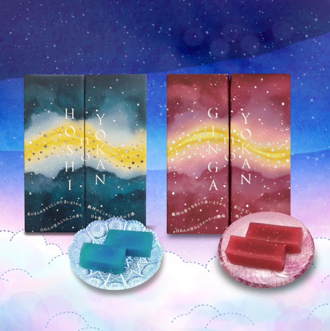 天の川のきらめきを閉じ込めたりんご風味の青い羊羹と、“天の川の香り”をまとったラズベリー風味の赤い羊羹。