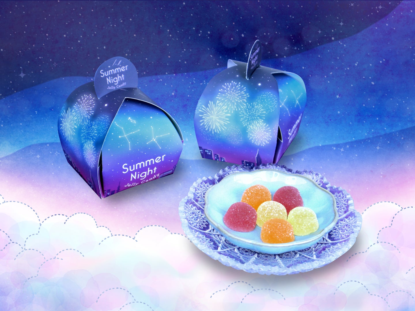 口いっぱいに広がる色鮮やかな3色のジェリーを、美しい夜空と共に