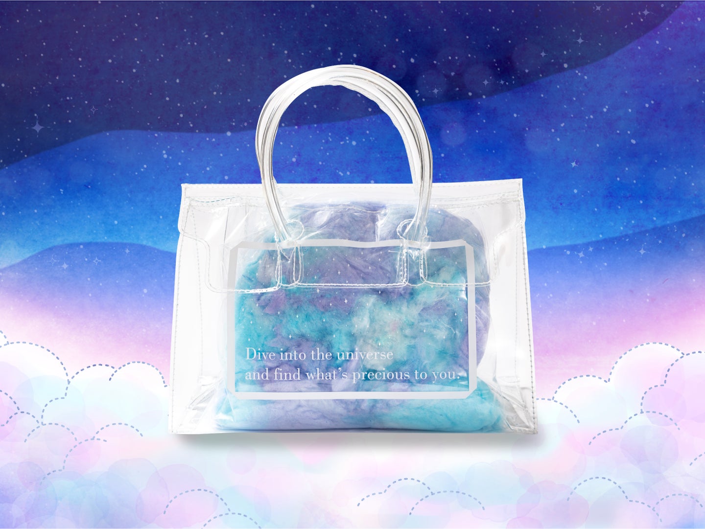 天の川銀河の星たちをたっぷりつめこんだ、わたあめとオリジナルクリアバッグのセット。プラネタリアTOKYOでしか味わえない、美しくておいしい天の川を楽しんで。