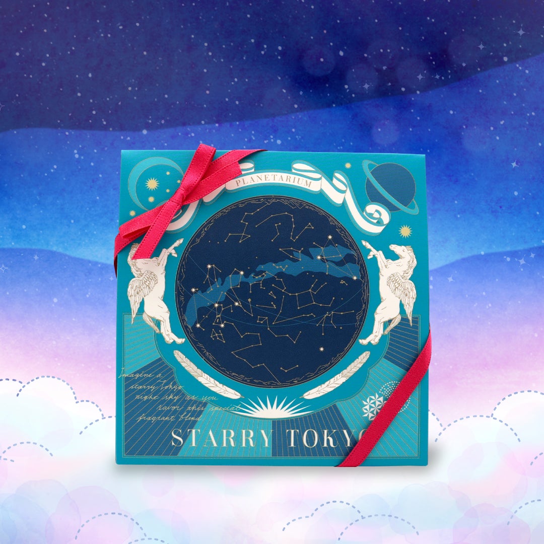 天の川をイメージしたラズベリーの香りと、都会の夜をイメージしたスパークリングワインの香りをブレンド。茶葉に星屑が散りばめられた、宇宙でここだけのブレンドティー。