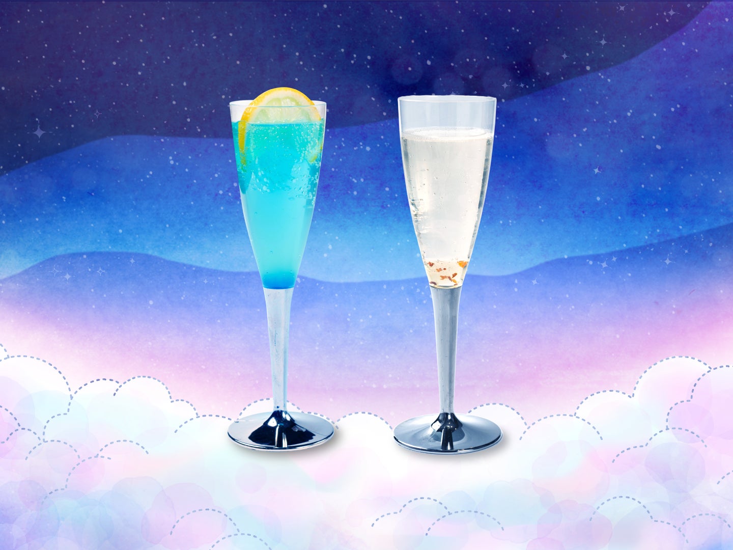 梅雨空の雲の上に広がる美しい天の川と星空を閉じ込めたフェア限定ドリンク。