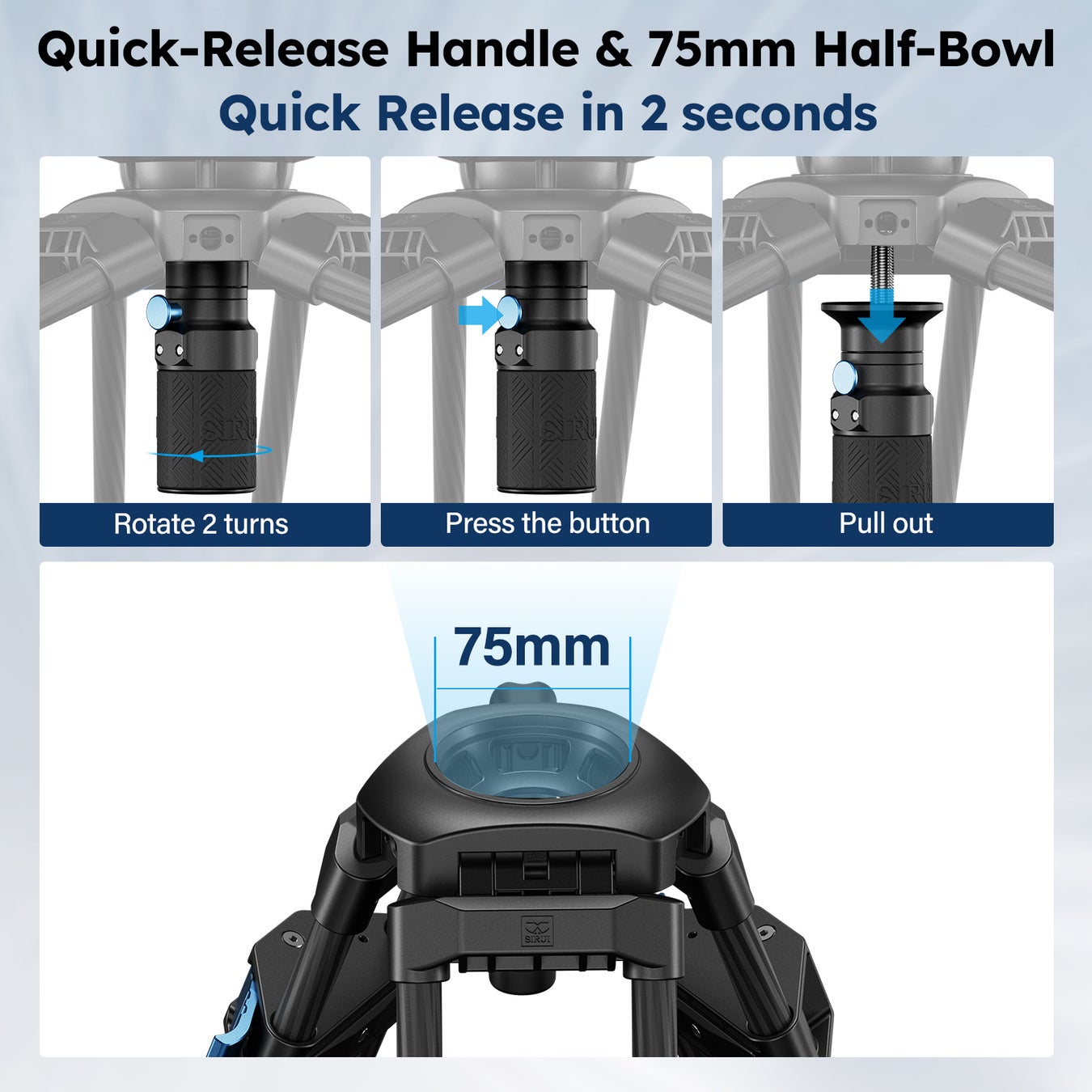 ほとんどのハーフボウル ハンドルは効率が低いという欠点があり、頻繁に使用すると緩んでしまいます。しかし、SIRUI 75mm ハーフボウル クイックリリース ハンドルは、わずか 2 秒でクイックリリースが可能です。ハンドルを 2 回転させてノブを押し、ハンドルを引き出すだけです。