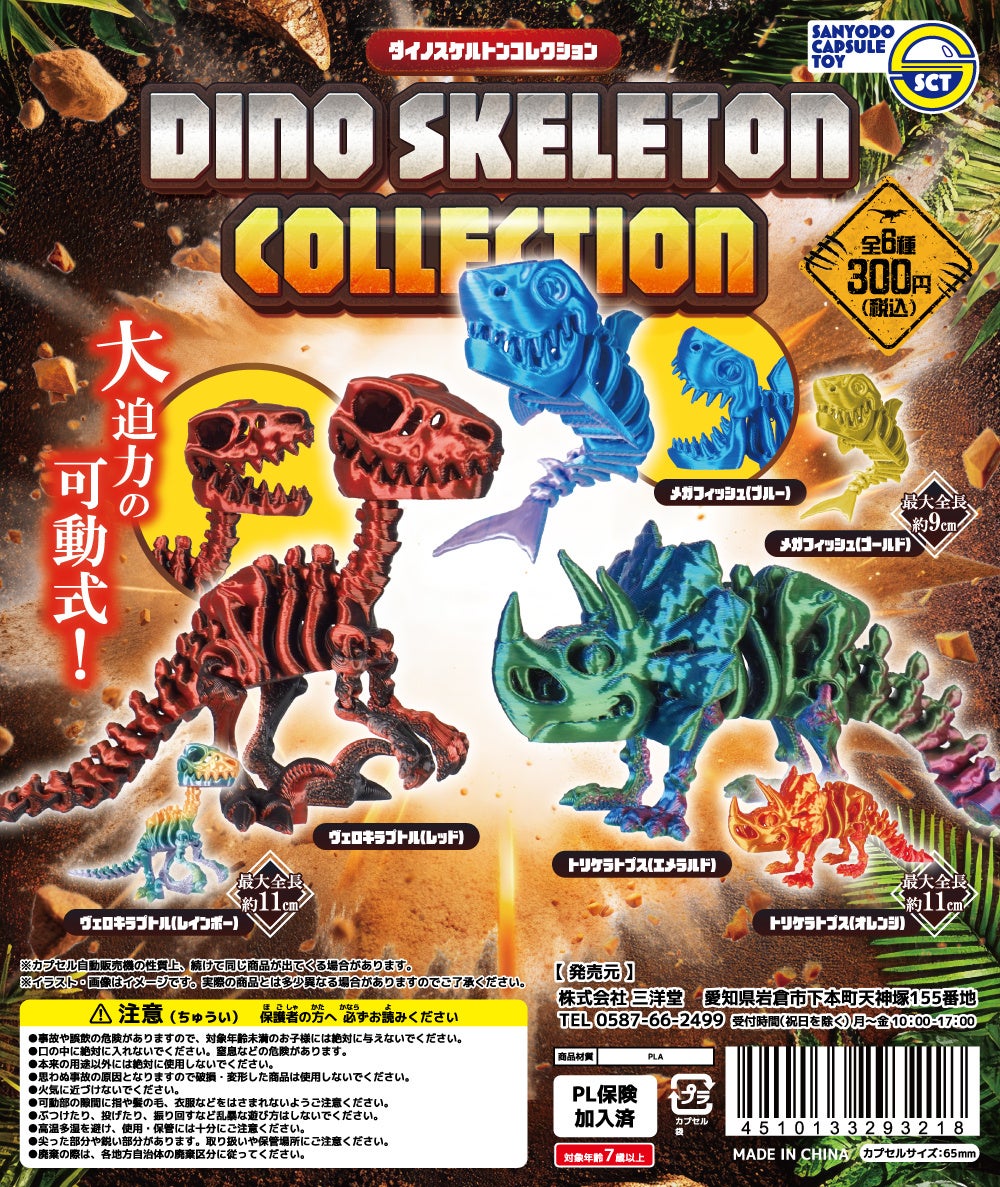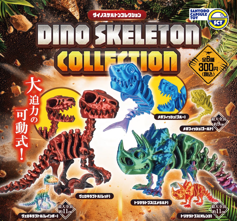 縁日商材をはじめとする玩具等の製造販売を行う株式会社三洋堂(本社:愛知県岩倉市、代表取締役:折小野 嘉輝)は、カプセルトイの新商品『ダイノスケルトンコレクション』全6種を、2026年1月26日(月)より全国のカプセルトイ自動販売機で1回300円(税込)にて順次発売を開始いたします。