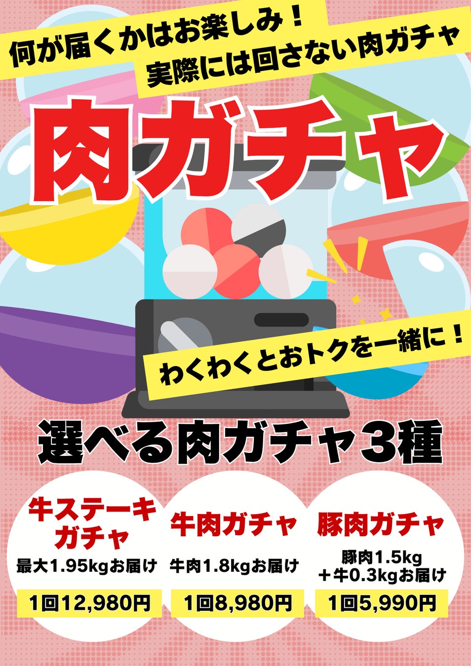 わくわくをお届けする中身は届いて開けるまでのお楽しみの、実際には回さない肉ガチャ。対象商品の中からランダムでお届けする、家族や友人と一緒にシェアしながら楽しめるお得なセット! 単品を選んで購入よりもお得に商品ゲットできるチャンス!