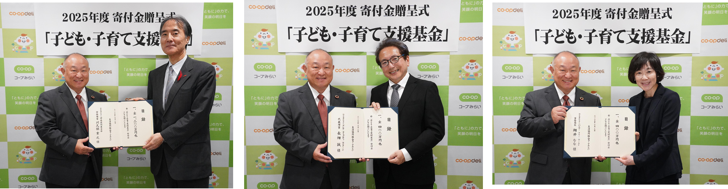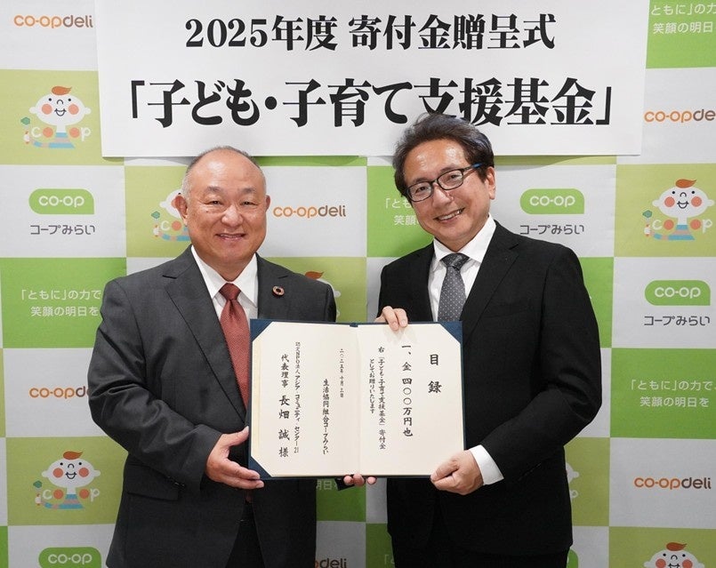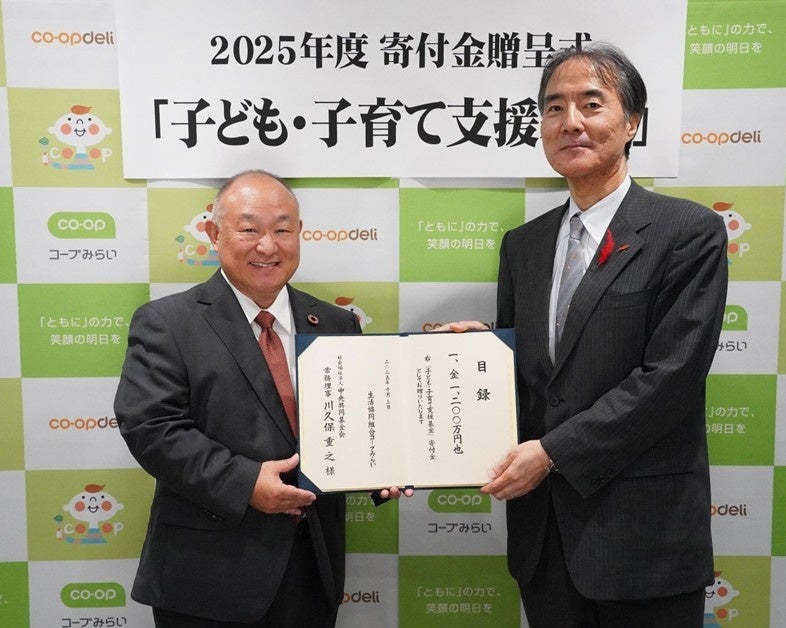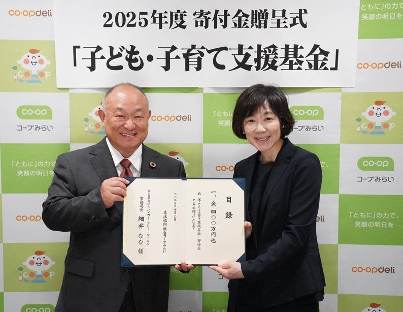 生活協同組合コープみらい(本部:埼玉県さいたま市、代表理事理事長:熊﨑 伸、事業エリア:千葉県・埼玉県・東京都)は、2025年度「子ども・子育て支援基金」から、社会福祉法人中央共同募金会へ1,200万円、認定NPO法人アジア・コミュニティ・センター21へ400万円、認定NPO法人ハンガー・フリー・ワールドへ400万円、合計2,000万円を寄付いたしました。10月3日(金)、コープみらい本部にて3団体への寄付金贈呈式を執り行いましたのでお知らせいたします。
