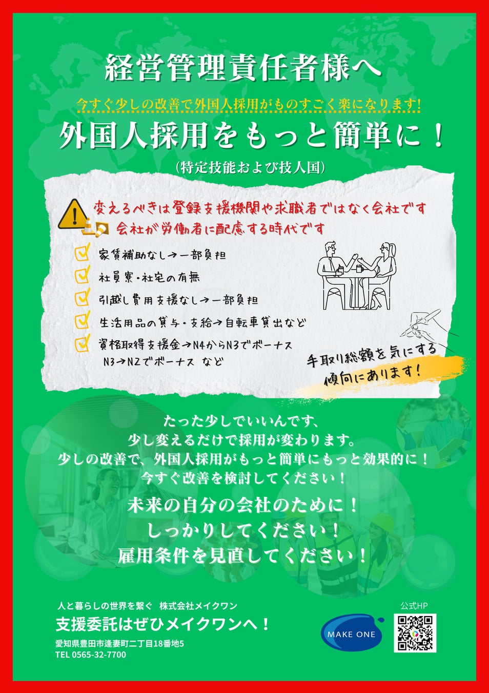 株式会社メイクワンは、多くの支援実績から「ほんの少しの条件改善が、採用・定着の成否を大きく分ける」という事実に着目し、登録支援機関や求職者に頼るだけでなく、企業自らが「選ばれる理由」を作るお手伝いをしたい。