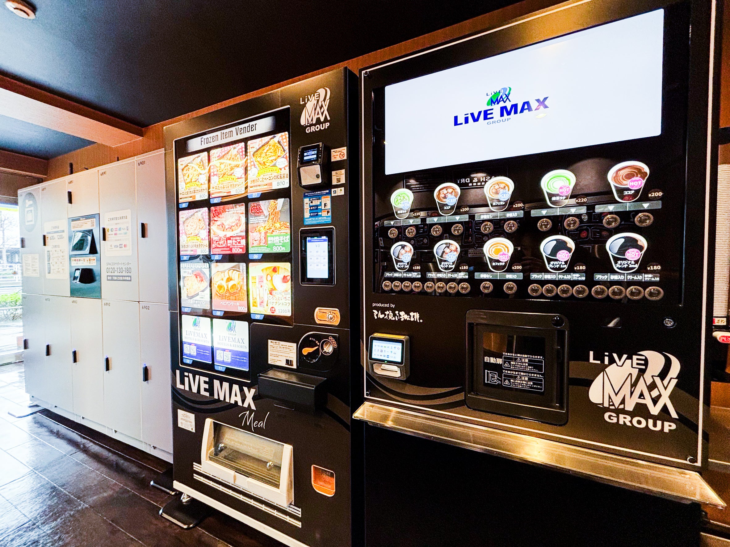 店内には、淹れたて感覚のコーヒーやドリンクを手軽に楽しめるカップ式自動販売機を設置。さらに、冷凍食品の自動販売機も備えており、軽食や食事を気軽に購入できる環境を整えています。