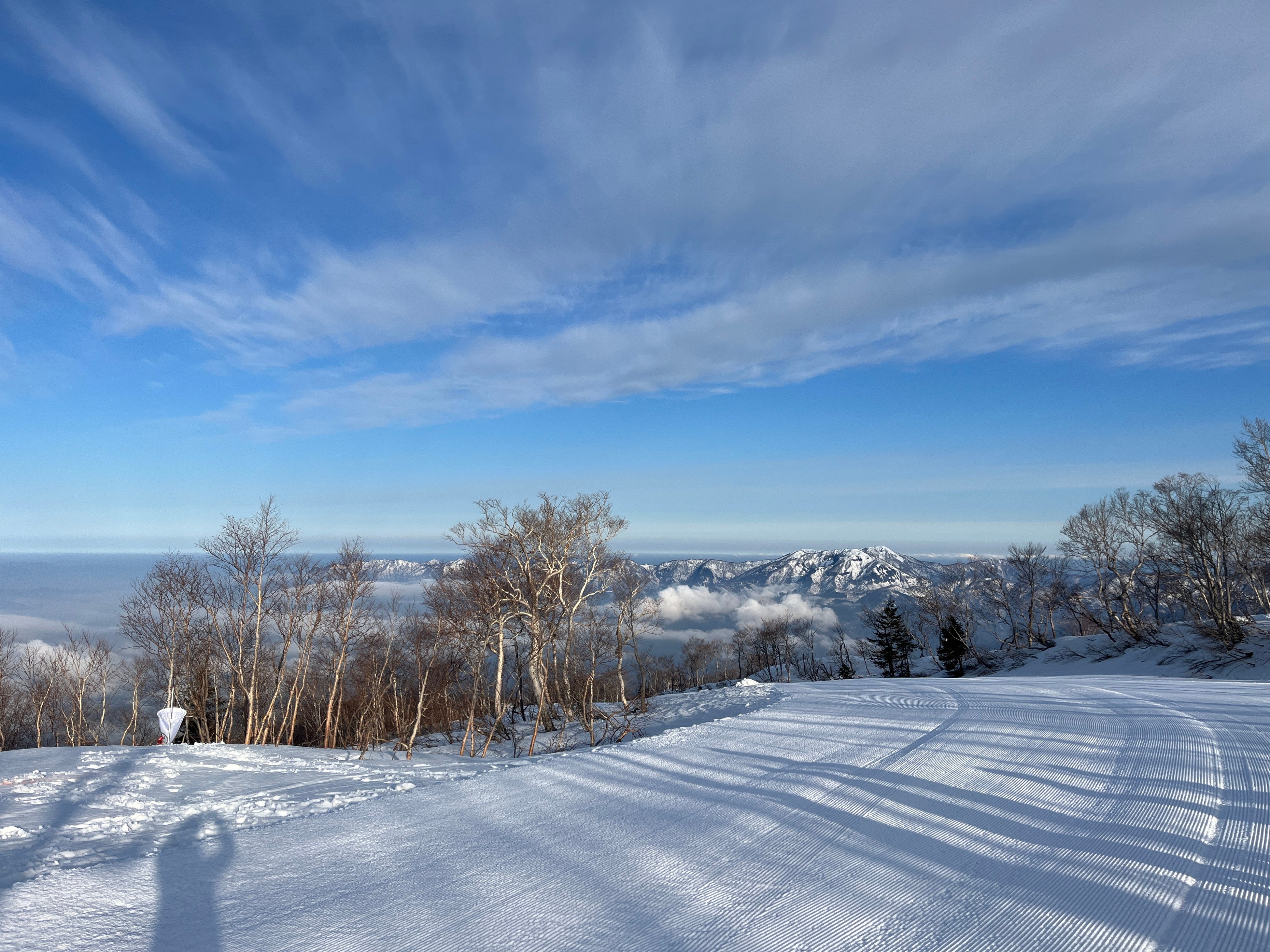 ヘリコプターに乗り込んだ瞬間から、すでに日常とは違う空気が流れているように感じました。機体が浮かび上がると、眼下にはどこまでも続く雪山が広がります。晴れていたこともあり、一面の白銀の景色に加えて、海のように広がる雲海まで見ることができました。山頂付近に降り立つと、そこには誰の足跡もない、まっさらな雪原が広がっています。誰も踏み入れていない斜面に自らのラインを刻んでいく“ファーストトラック”という、とても快適で、なんとも贅沢な、特別な体験でした。