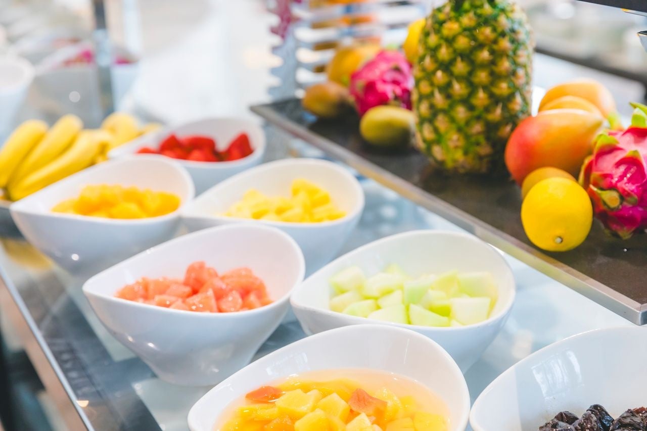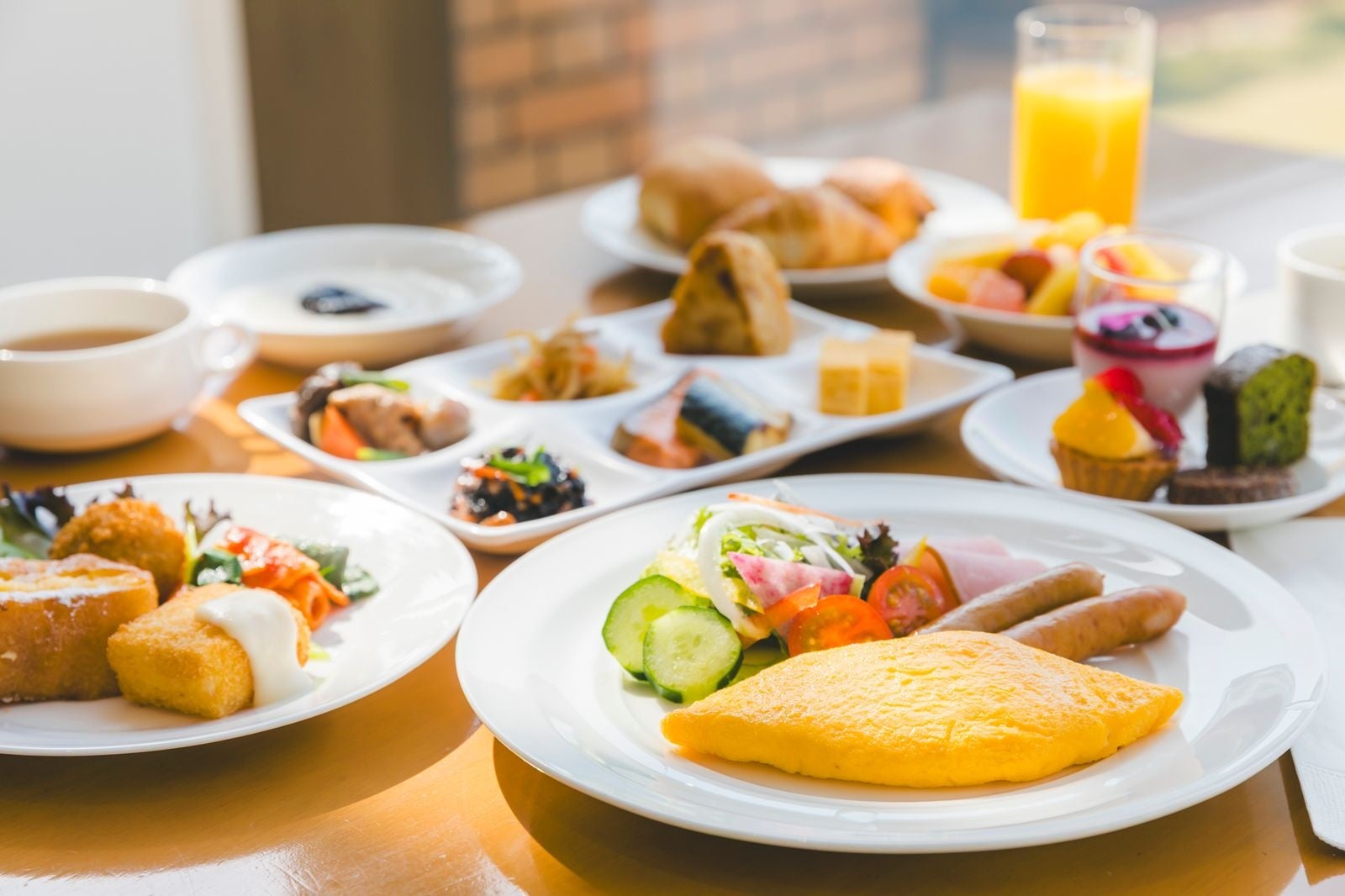 当館では、地元の食材をふんだんに使用したバラエティ豊かな朝食バイキングをご用意しており、旬の味覚を生かした和洋メニューや焼き立てパン、フレッシュなサラダなど、お子さまから大人までお楽しみいただけるラインナップを取り揃えております。