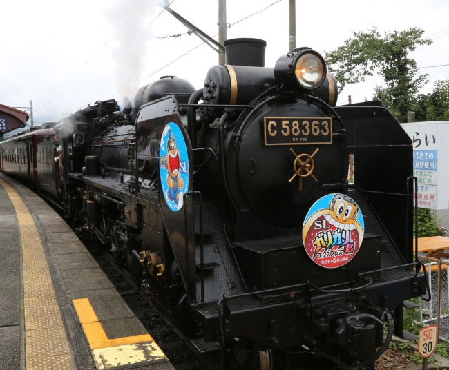 ・8月6日~31日のSL運転日は、SLデフへガリガリ君のイラストを掲出し運転
