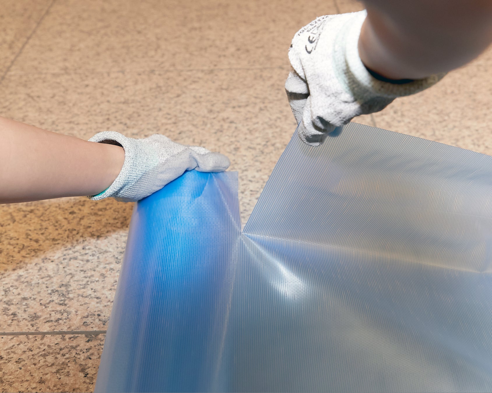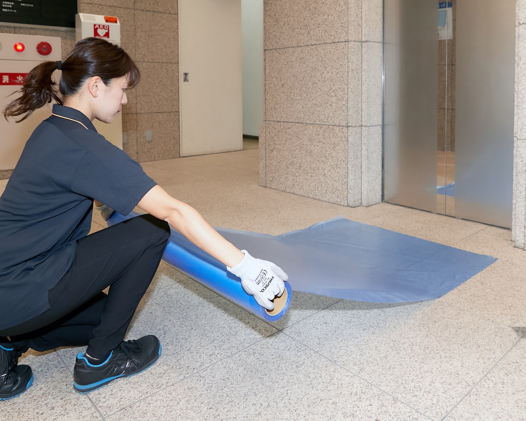 誰もが簡単に施工ができるように、両端に粘着剤が付いた養生シートです。シートはハサミやカッターを使わず手で切ることができるので、道具を出す手間が省けて作業効率アップに繋がります。再剥離も可能なため、失敗しても何度でも施工が可能です。粘着部は剥離紙を無くし不要なゴミが出ない仕様のため、分別の負担も軽減できます。