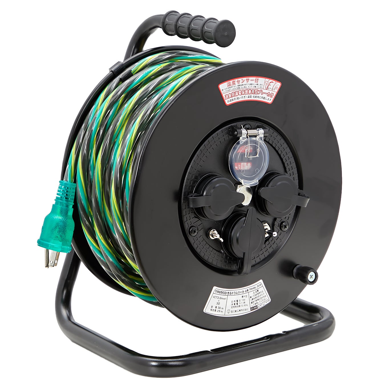 電線が光るドラムリールです。主に建築現場や夜間の工事現場、工場内の暗い場所で力を発揮します。電線が光ることで電源につながっていることが一目でわかり、視認性を高めることでコンセントの場所を目視で確認ができます。また、線が光ることで誘導灯代わりになるので安全性を高めることができます。