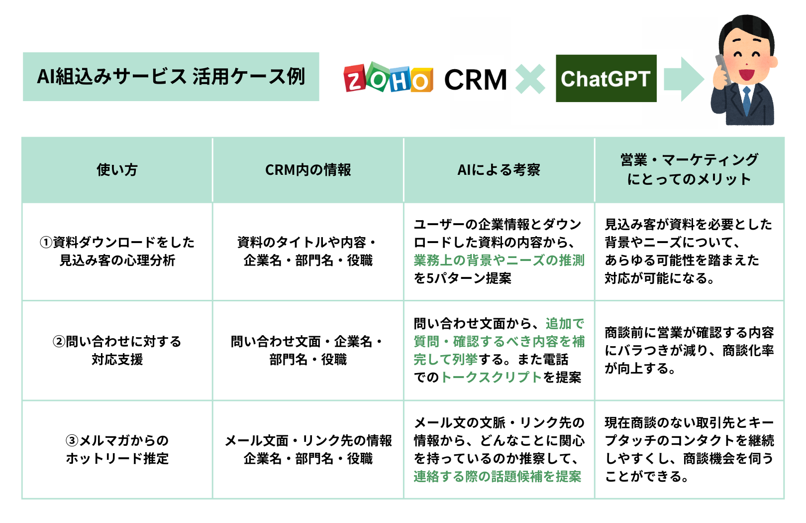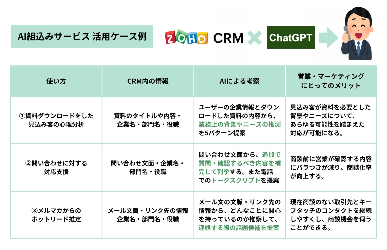 Zoho Corporationが提供している、世界で多くの企業が導入するクラウド型顧客管理ツールZoho CRMに、昨今大きな話題を呼んでいるChatGPTを掛け合わせることで、見込み客の心理状況を踏まえた営業アプローチ、業務効率化を実現します。AIの分析・考察・提案内容は目的に応じてカスタマイズ可能で、資料をダウンロードした見込み客の心理分析、問い合わせに対する対応支援、メルマガからのホットリード推定などを想定しています。