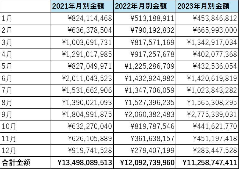 2021年から2023年まで共通して、落札金額は6月から9月が高くなっています。特に、9月は2022年、2023年ともに最高金額となっており、2021年も2番目に高い金額でした。