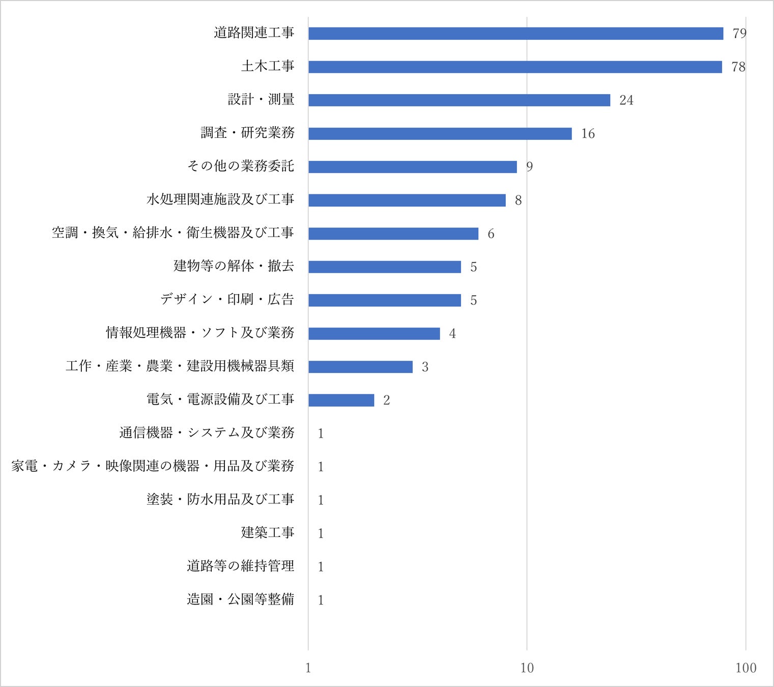 最多は「道路関連工事」の79件、次いで「土木工事」の78件、「設計・測量」の24件が上位となりました。