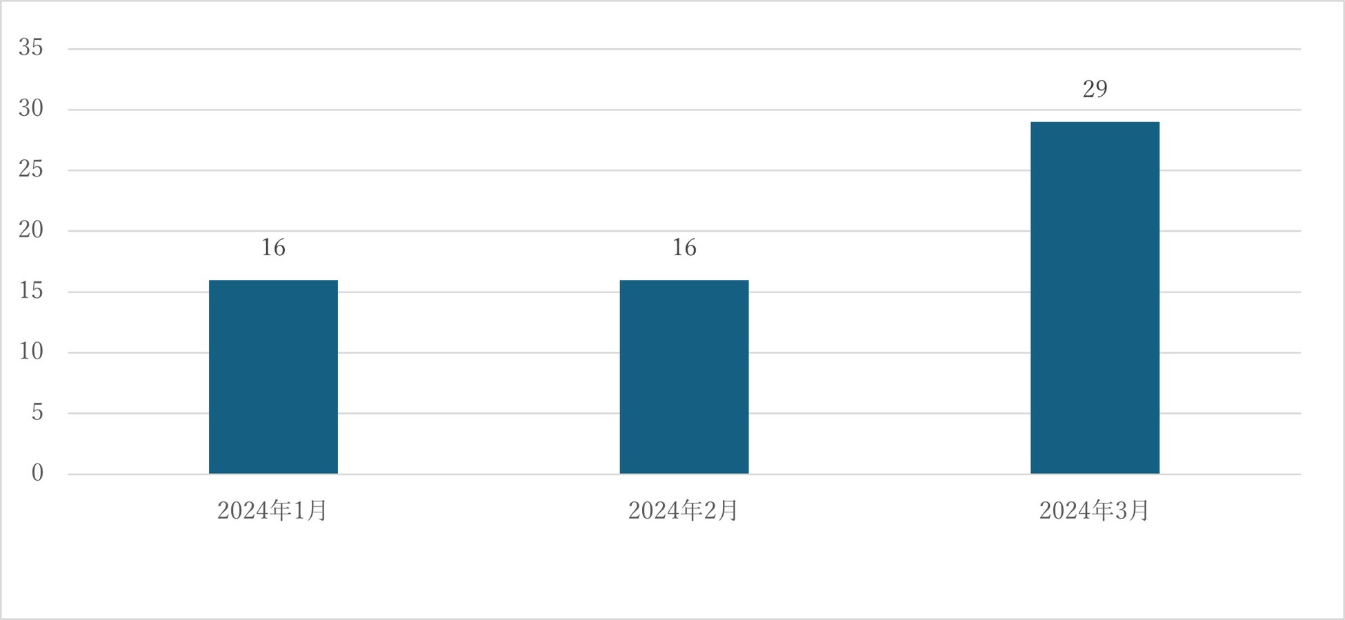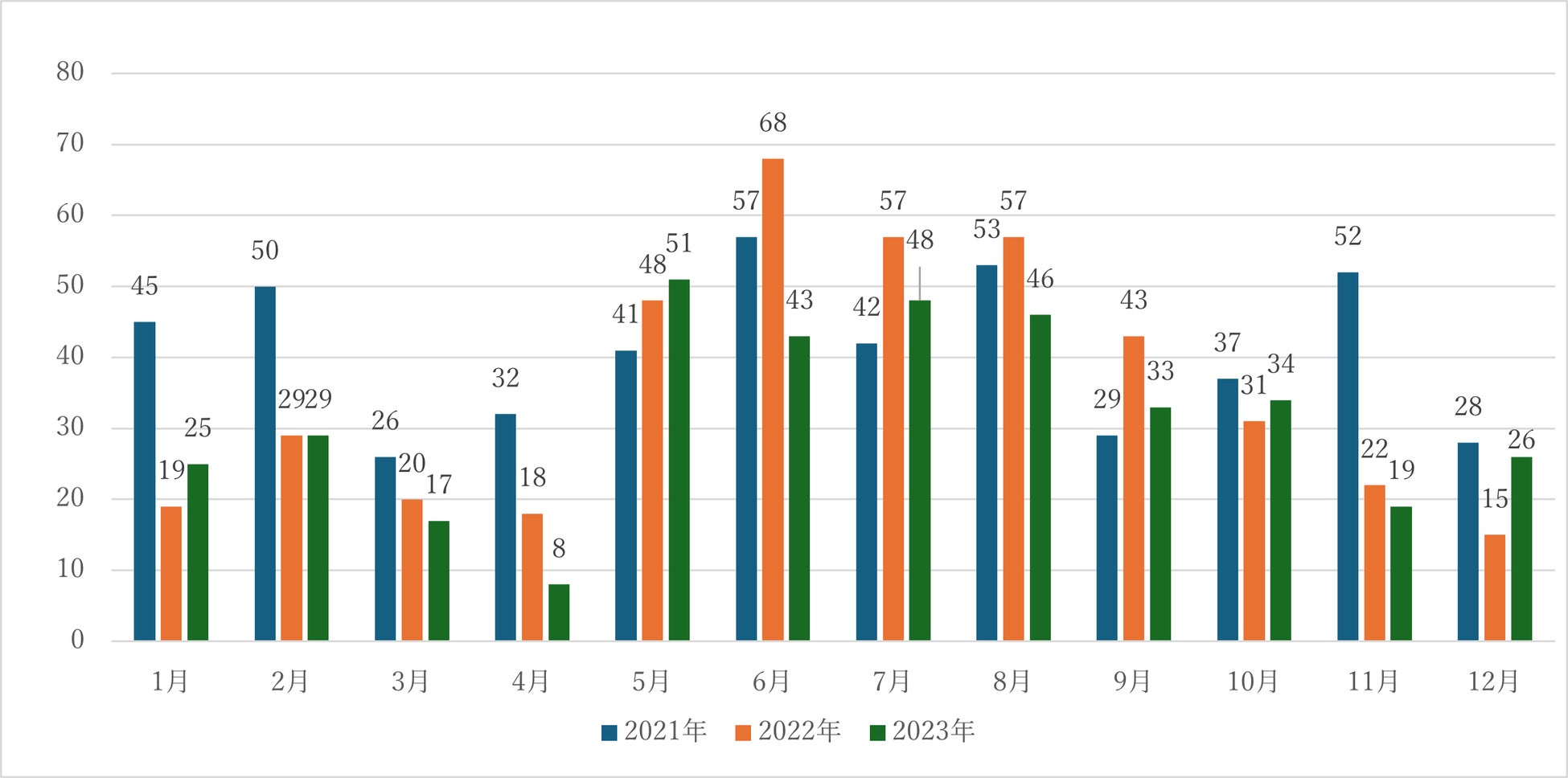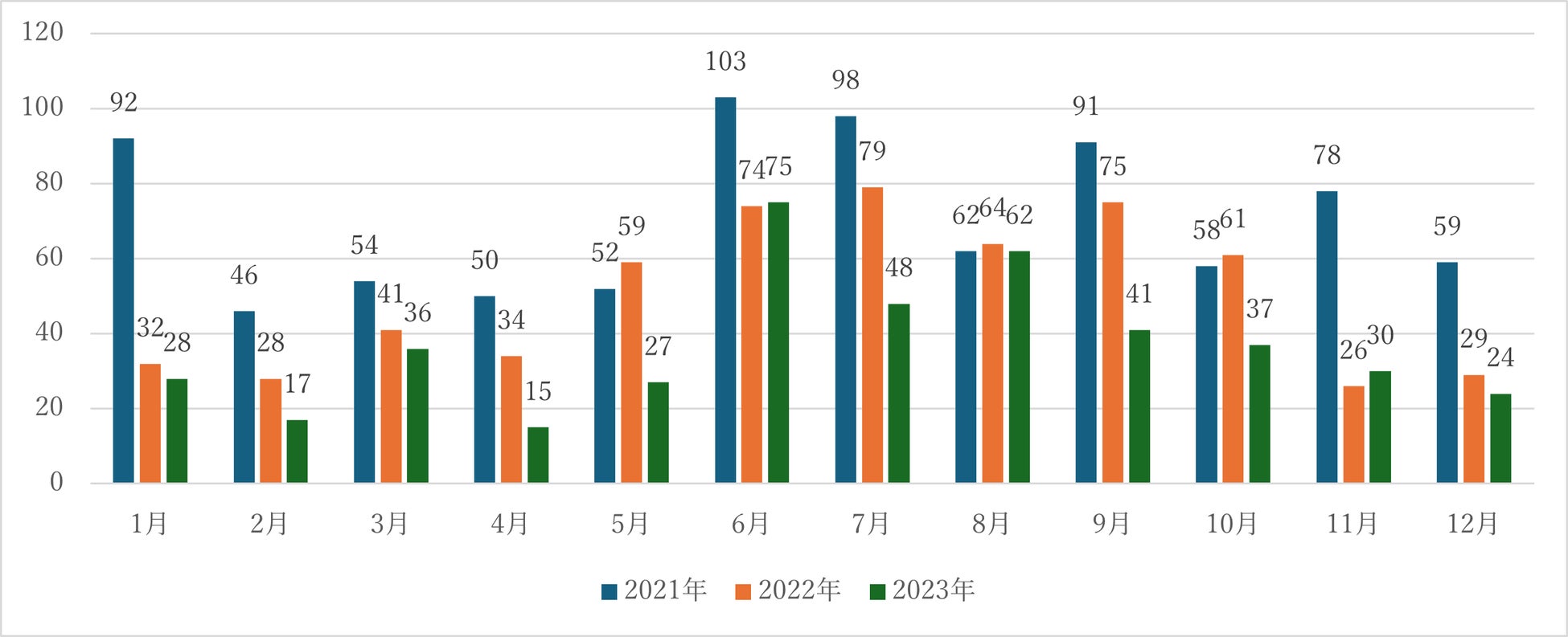 3年間で最多の月となったのは2022年6月で件数は68件で、最低件数となったのは2023年4月の8件でした。