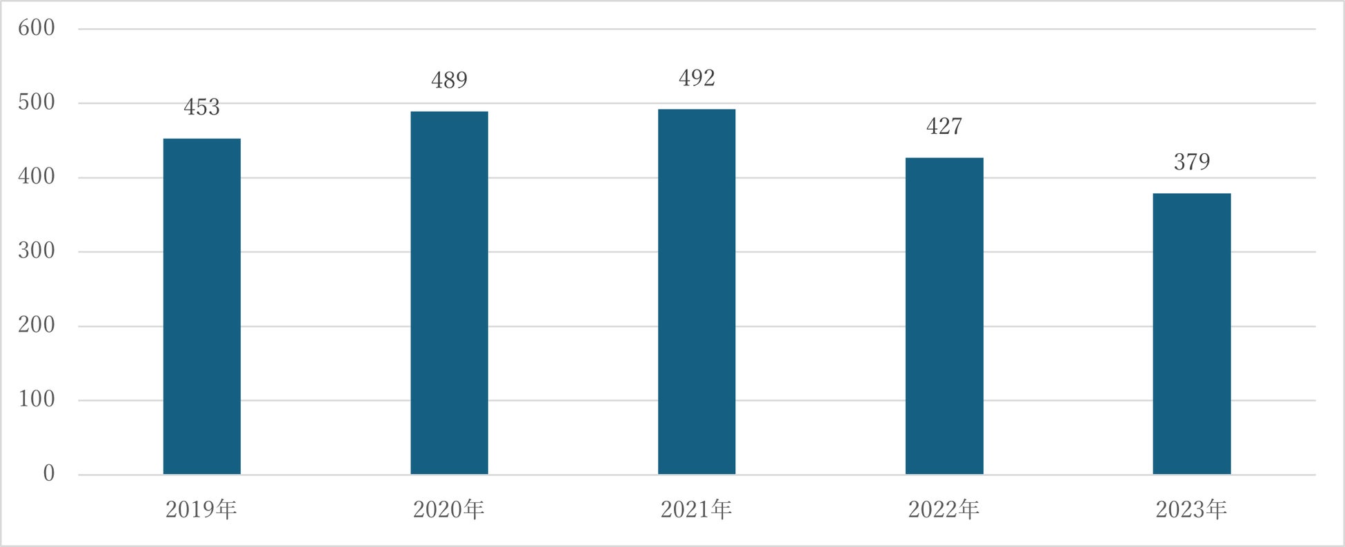 「地方創生」のワードを含む入札公告は2018年から2022年までに2,240件でした。最多となったのは2021年の492件で、2023年に過去5年で最低の379件となりました。