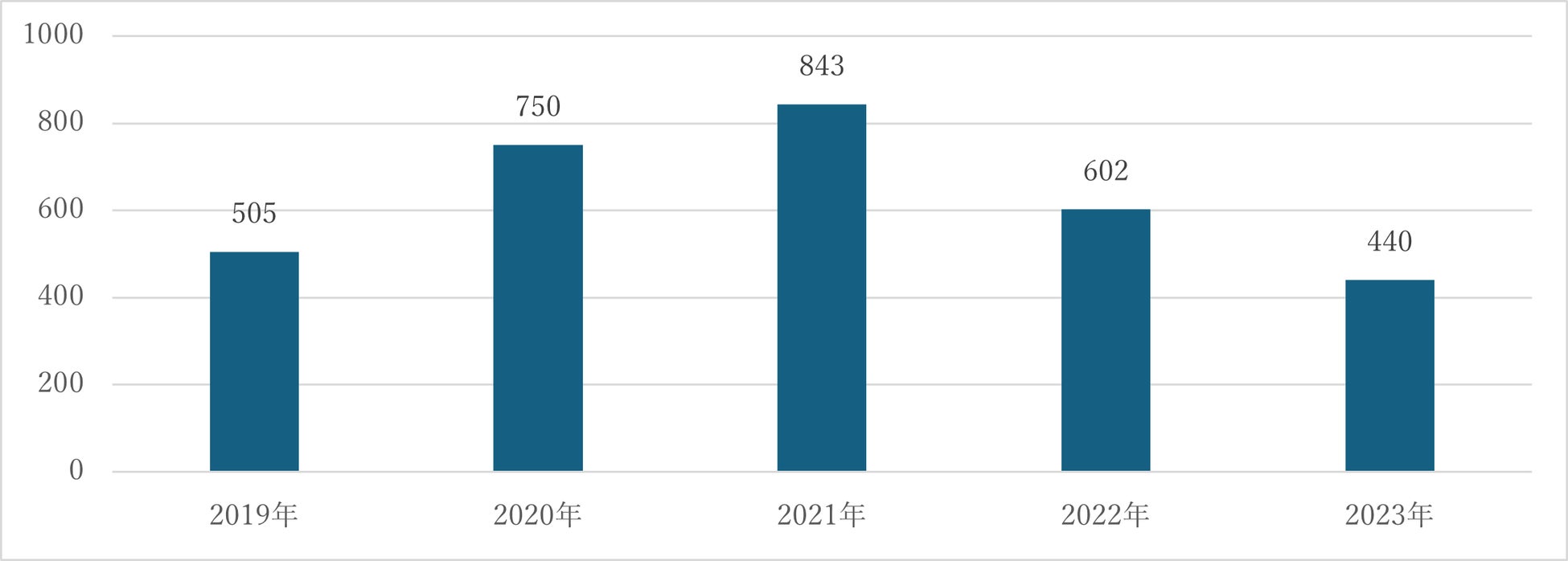 落札件数は2021年年まで増加し、最多の843件となり、以降は減少傾向となりました。最低件数は2023年に440件でした。落札金額は2020年が最高金額のおよそ139億3,630万円で、最多件数となった2022年はおよそ134億9,809万 円と若干減少し、以降は件数同様に減少しています。