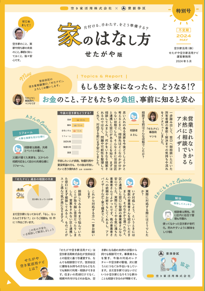 空き家所有者へ直送されるフリーペーパー『家のはなし方』の特別号を発刊。自治体による空き家問題対策の先進区であり多くの空き家を抱える世田谷区にて、福祉部門と連携。空き家予備軍に正しい対処と選択肢を啓発するため、1万4千部を市民に対して福祉チャネルから配布、手渡しをしています。この啓発のためのフリーペーパーを、空き家活用株式会社、世田谷区と連携し発行しました。
