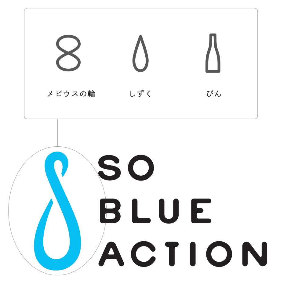 その「あお」をリターナブルびんとびんリユースの仕組みでひとつひとつを守り、一生の青空に繋いで行くということをしずくにも葉の形にも、びんのフォルムにも見えるメビウスの輪で表現しました。