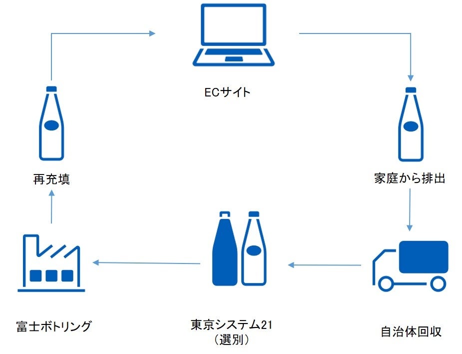 東京23区で飲まれたリターナブルびん入り飲料が生産地へ戻る仕組みを構築。東京23区にお住まいの方は、ECサイトを通じて購入いただき、飲み終わったリターナブルびんは資源物の行政収集に出していただくことでびんリユースの仕組みに戻すことができます。