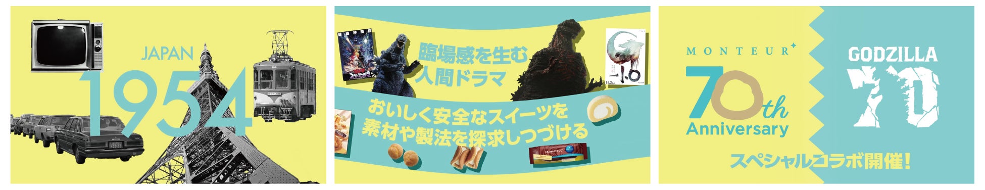 共に70年の歴史を刻んできたモンテールとゴジラの出会いを記念して、2本の動画を作成。それぞれの歩み、製品・作品に込めた思いを振り返る「70th 記念」動画となっています。そして、これからスタートするコラボ施策への期待感を高める「予告編」動画。コラボ施策のスタートを華々しく伝えると共に、モンテール・ゴジラ両者の歴史や貴重なアーカイブ写真を発信します。