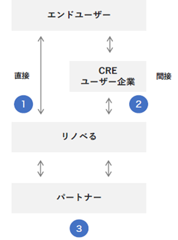 1つ目は、個人のお客様に住宅リノベーションを提供する「住宅リノベーションプラットフォーム」です。日本全国の不動産、設計事務所、工務店、インテリア、金融機関まで網羅するパートナーネットワークを拡充し、お客様と事業者の最適なマッチングを行います。国内No.1の実績を有する中古マンション探しとリノベーションのワンストップサービス「リノベる。」や都心のプレミアムワンストップサービス「ESTATH」等を提供し、自分らしい暮らしの実現をサポートしています。