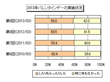 2013年のバレンタインデーにプレゼントをしたりもらったりした人は58.0%、女性10~30代では7割弱を占めます。男性10~20代は「特に何もなかった」が6割弱、結婚していない人では半数強となっています。
