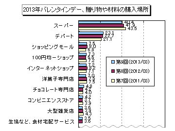 2013年のバレンタインデーにかけた費用は「500円~1000円未満」が22.1%、「1000円~2000円未満」が22.9%となっています。贈り物や材料の購入場所は「スーパー」(40.4%)が最も多く、次いで「デパート」(23.1%)となっています。「100円均一ショップ」は、女性の若年層で多くみられます。