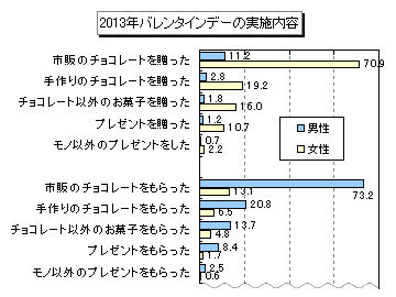 ■2013年のバレンタインデーにプレゼントをしたりもらったりした人は6割弱。「市販のチョコレートを贈った」は男性1割、女性7割、「市販のチョコレートをもらった」は男性7割強、女性1割強。女性10代ではチョコレートやお菓子をもらったという人が3~4割と、他の年代より多い