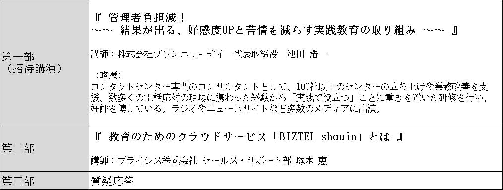 各講座にコールセンター業界で活躍する講師を招き、経験・実績に裏付けされた、現場で役立つノウハウについて解説します。また、BIZTELがサービス開始以来16年間で蓄積した、コールセンター運営の効率化・業績向上を実現させる効果的なITの活用法も併せて紹介する予定です。