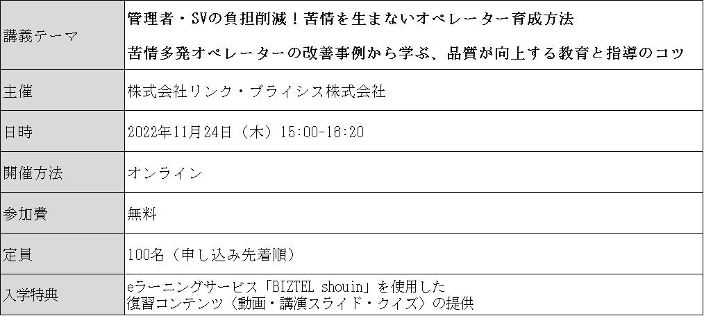 6年連続 国内シェア第1位(※)のクラウド型コールセンターシステム「BIZTEL(ビズテル)」を展開する株式会社リンク(本社:東京都港区、代表取締役社長:岡田 元治)は、本日、コールセンター運営に携わる方々に向け、応対品質・業務効率化・顧客満足・スタッフ採用・社内教育などの多岐にわたるテーマについて学ぶことができるオンラインスクール「BIZTEL大学」を開校することをお知らせします。第1回の講義は「苦情を生まないオペレーターの育成法」をテーマに、2022年11月24日(木)に無料で開催します。