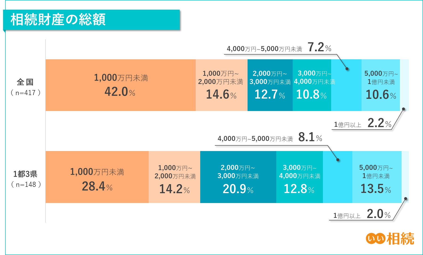 ただ、相続人の居住地が1都3県(東京都、神奈川県、埼玉県、千葉県)の場合、「1,000万円未満」が最多ではあるものの、割合は28.4%と全国平均より13.6%減り、次いで「2,000万円以上~3,000万円未満」が20.9%、「1,000万円以上~2,000万円未満」が14.2%と続き、全国平均の2位と3位が入れ替わる結果となりました。