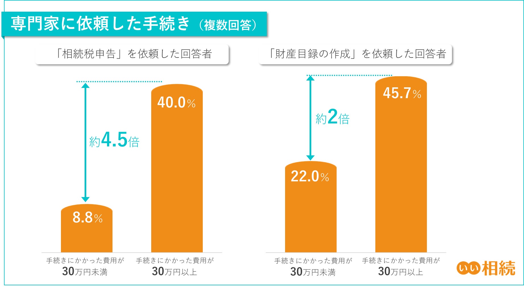 また、専門家に依頼した手続きの内容について、手続きにかかった費用が「30万円未満」と「30万円以上」の方に分けて比較すると、専門家に依頼した項目のうち「相続税申告」については、「30万円未満」では8.8%であるのに対し、「30万円以上」では40.0%が依頼しており、約4.5倍もの差がありました。