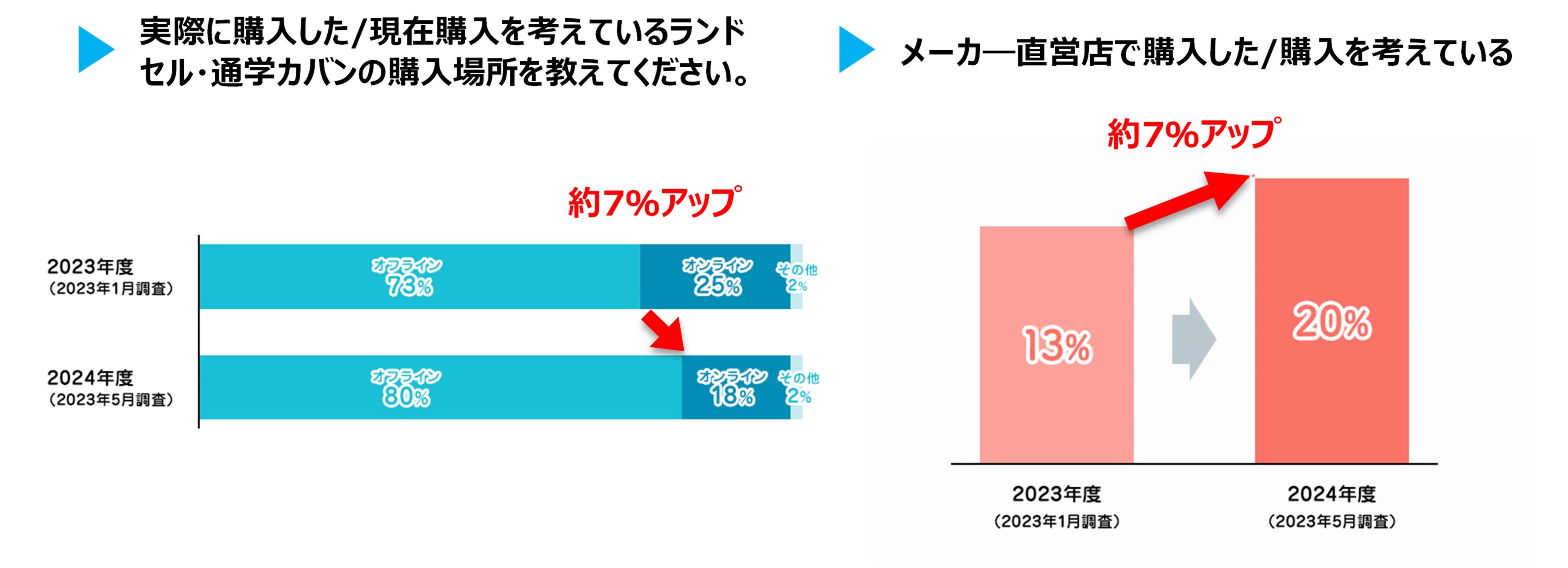 【調査概要】 ●2024年度入学者対象 ランドセルに関する調査 調査方法:インターネット調査 調査対象:2024年度小学校入学予定のお子さまをお持ちの24~45歳の方 調査期間:2023年5月8日~5月12日 サンプル数:2,100 ●2023年度入学者対象 ランドセルに関する調査 調査方法:インターネット調査 調査対象:2023年度小学校入学予定のお子さまをお持ちの24~45歳の方 調査期間:2023年1月19日~1月24日 サンプル数:2,208 |