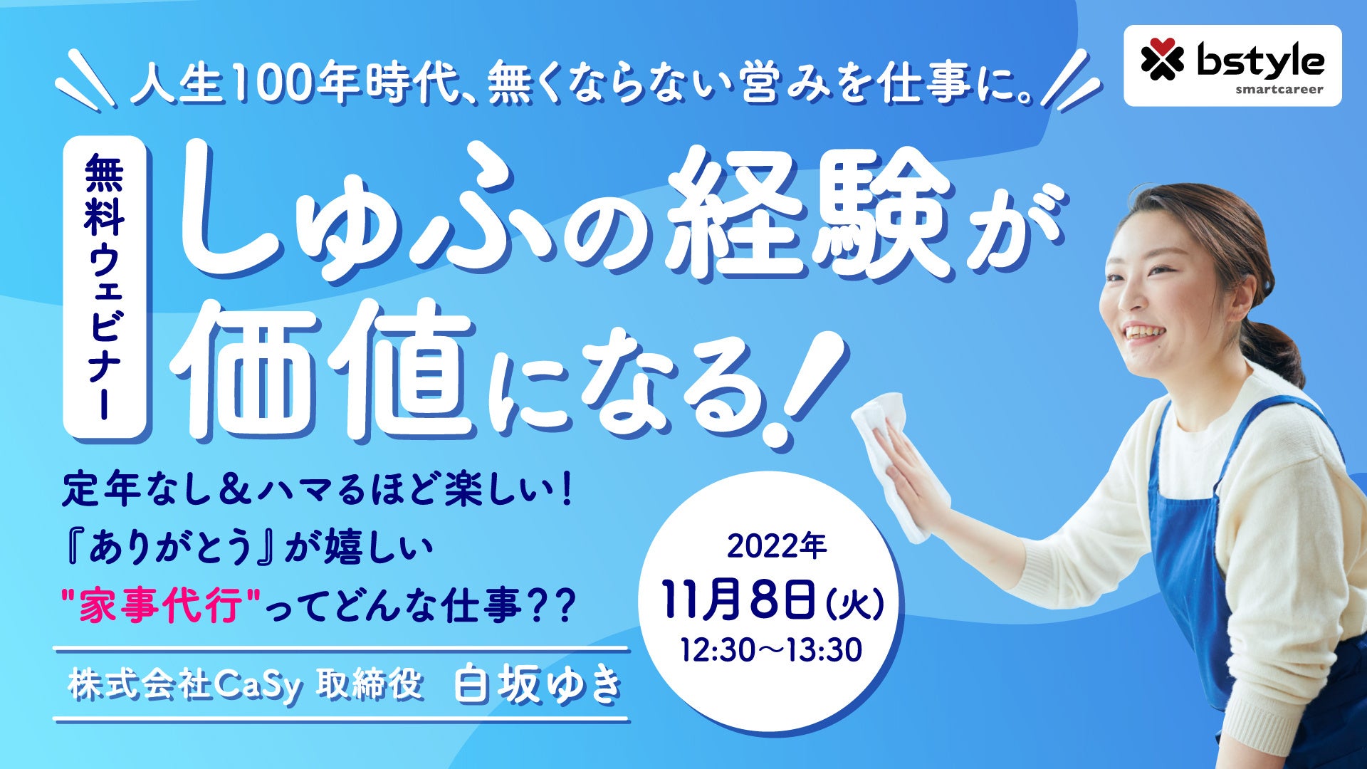 家事代行サービスを中心とした暮らしのマッチング・プラットフォームを手掛ける株式会社CaSy(本社:東京都品川区、代表取締役CEO:加茂雄一、以下カジー)と株式会社ビースタイル スマートキャリア(本社:東京都新宿区、代表取締役:三原邦彦、以下ビースタイル スマートキャリア)は、社会活躍を望む多くの方々に向けて家事代行の魅力と実像についてお伝えする無料ウェビナーを共同で開催いたします。