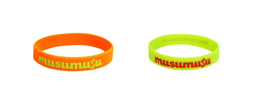 ビビットな色合いが可愛らしい、musumusuのロゴ付きのラバーリストバンドです。