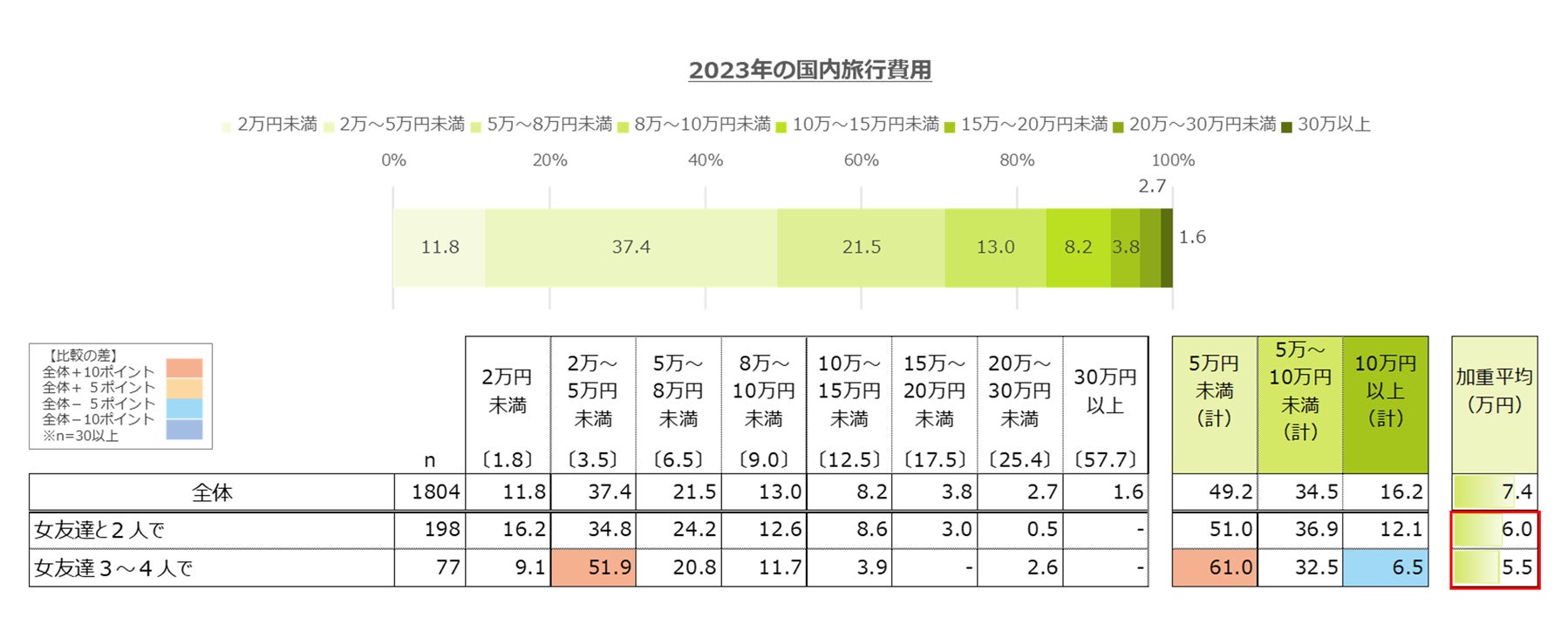 女子旅の平均額は「女友達2人」で行く場合は6万円「女友達3〜4人」で行く場合は5.5万円と「2人旅行」の方が上回っています。