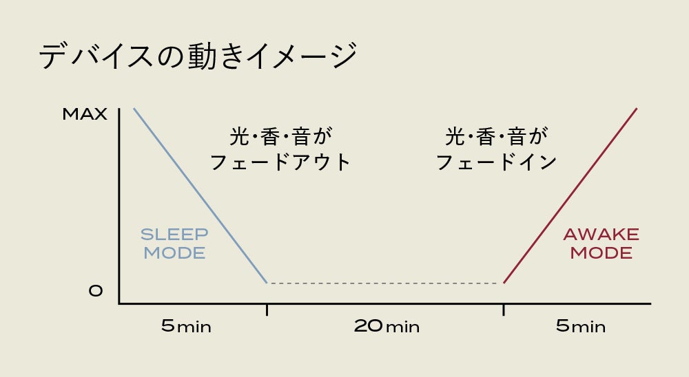 最高の睡眠をつくる覚醒のスタートを切るためには「目覚めをよくする」ことが重要です。朝方はレム睡眠の時間が長くなるため、20分前後の間隔で「ノンレム→レム」の切り替えが行われています。レム睡眠時は覚醒しやすいため、小さな物音でも目覚めやすくなっています。本製品はセットした起床時間の20分前から光・香・音で徐々にアプローチし、一番目覚めやすいタイミングでの目覚めを演出します。