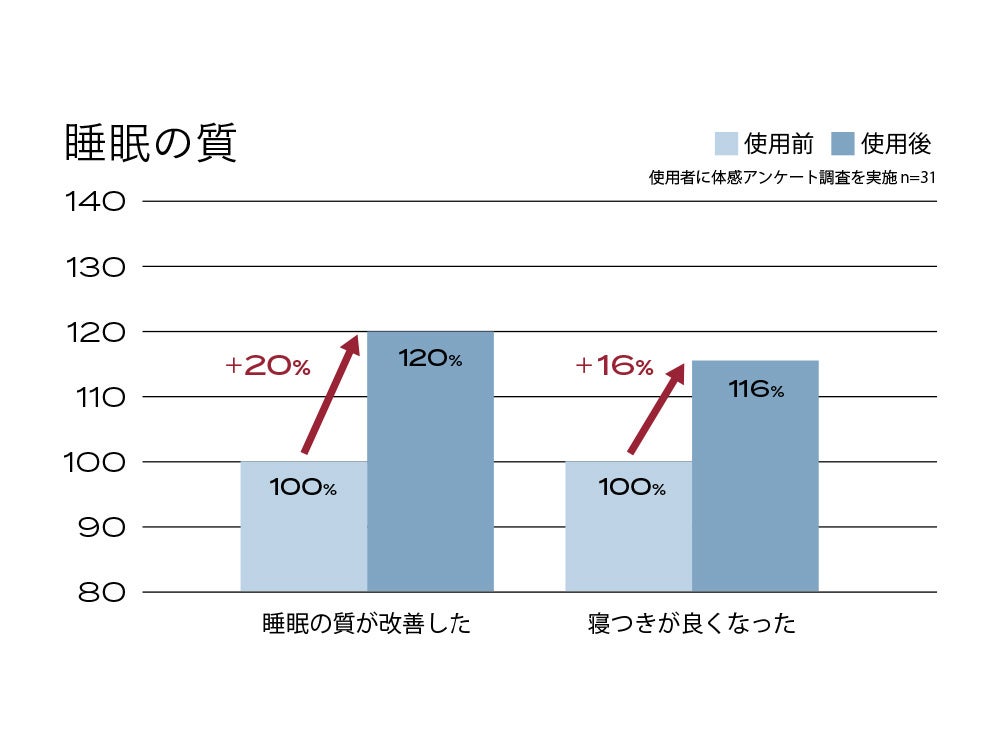 本製品を使用した睡眠の体感調査の結果、入眠しやすい環境をつくることで睡眠の質が改善したと回答した方は20%アップ、寝つきが良くなったと回答した方は16%アップという結果が得られました。