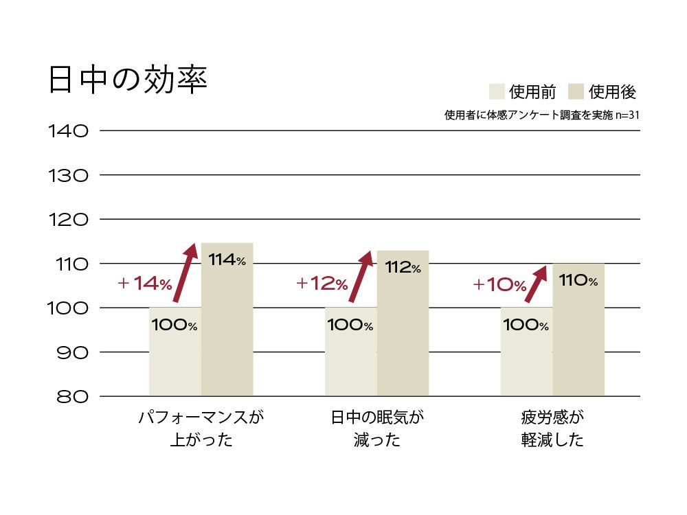 睡眠の質が向上することで日中のパフォーマンスが向上、眠気の軽減、疲労感などそれぞれ約10%以上の改善結果が得られました。