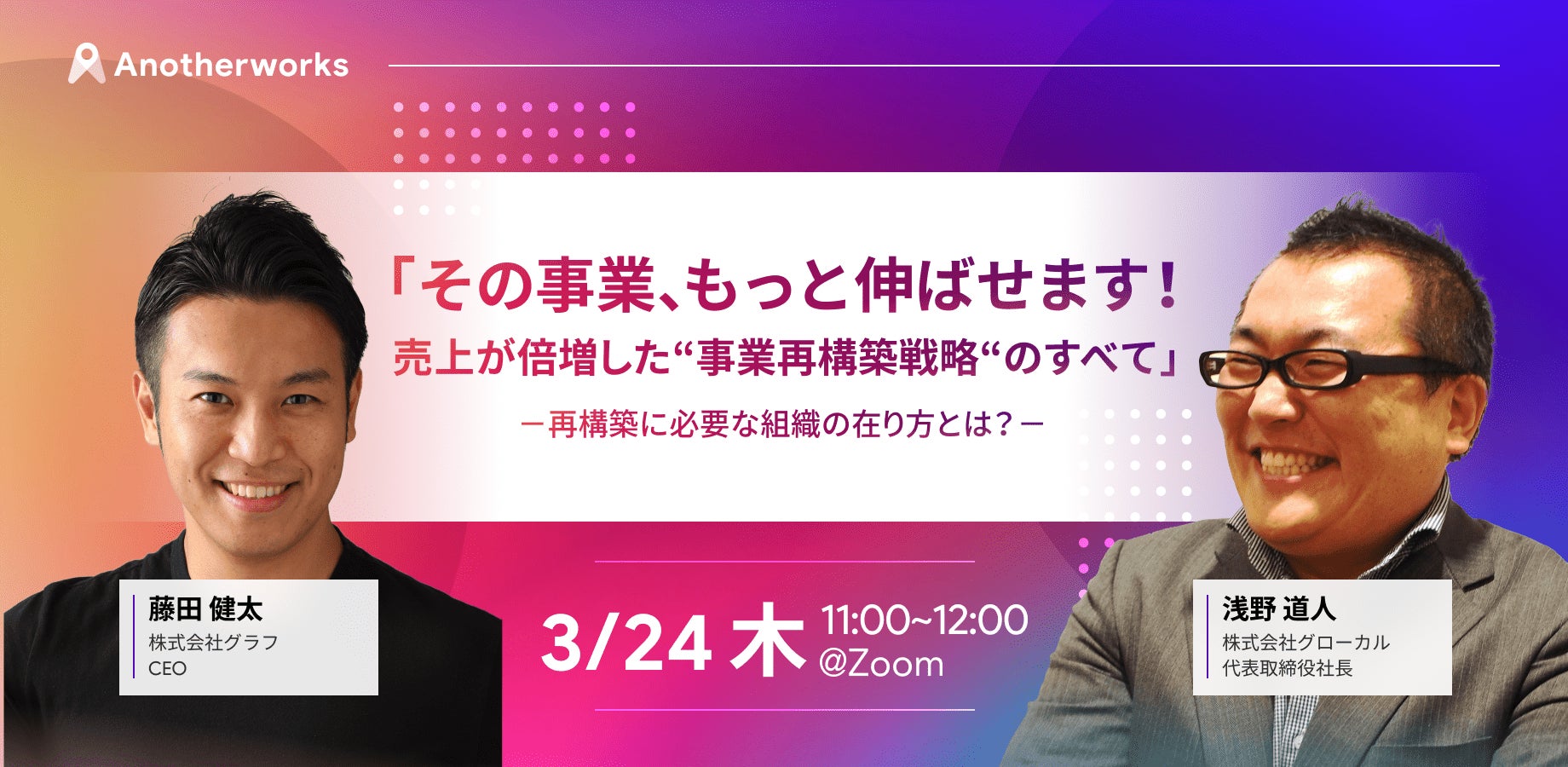 「売上が倍増した“事業再構築戦略”のすべて」をテーマに、弁護士ドットコム・メドレー・セルソースなどベンチャー企業の初期フェーズから営業上場までの組織構築を牽引してきた藤田健太氏(株式会社グラフ CEO)と共に、実例を用いながら、再構築に必要な組織の在り方についてお伝えいたします。