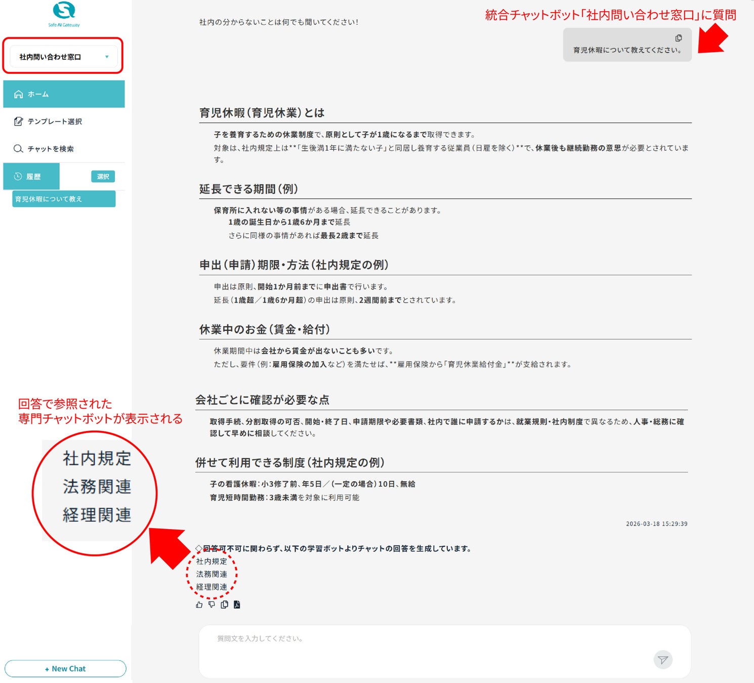 下図は育児休暇についての社内問い合わせを想定した利用イメージです。複数部門にまたがる問い合わせも、「社内規定」「法務」「経理」など、複数の専門チャットボットを統合した「社内問い合わせ窓口」に質問するだけで、AIが関連するボットの知識を横断して回答を自動生成します。