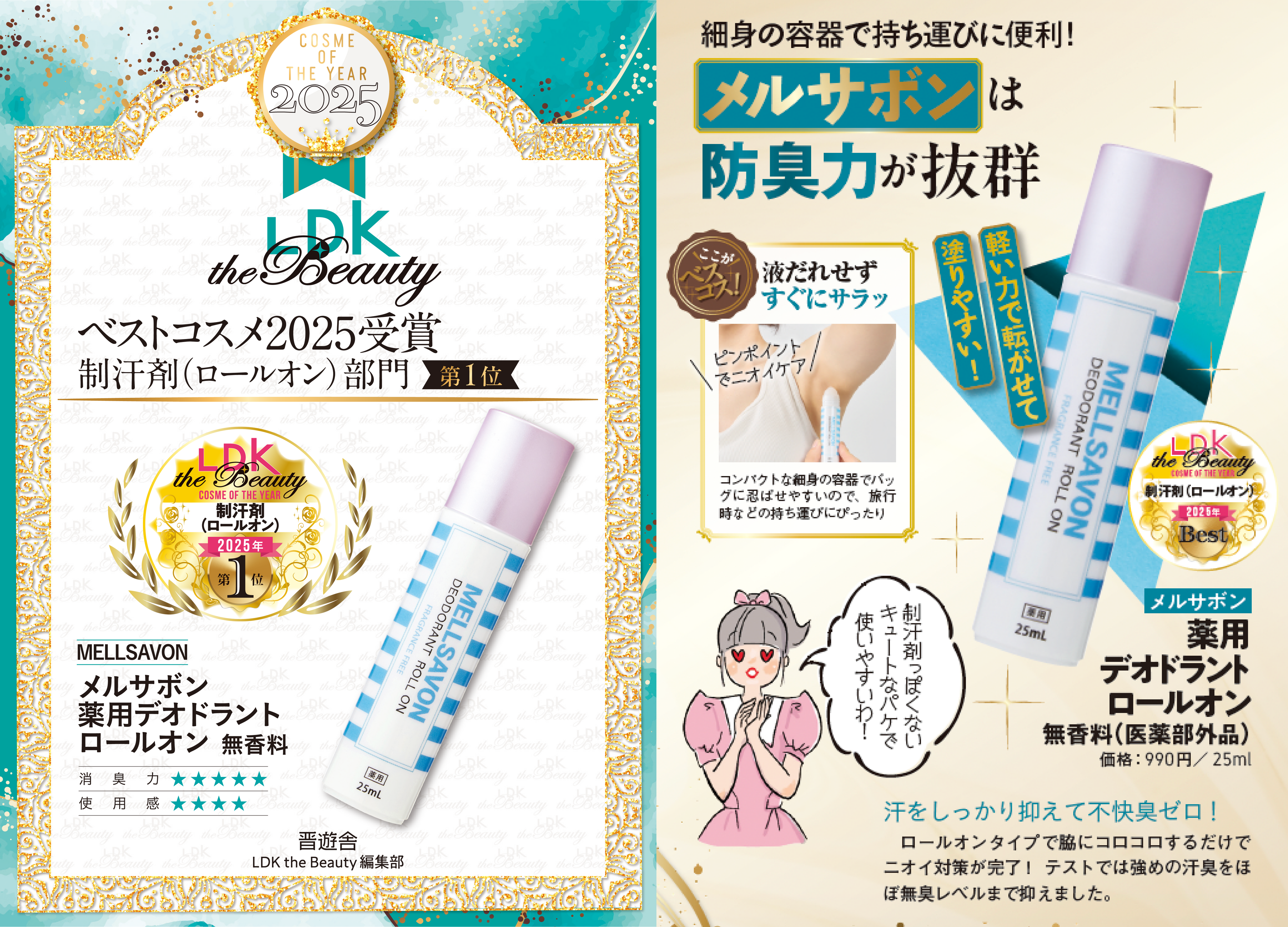 LDK the Beautyが1年間でテストした4060個のコスメの中から、2025年のベストコスメを決める特集(LDK the Beauty 2026年1月号)にて、『メルサボン薬用デオドラントロールオン無香料』が“制汗剤(ロールオン)部門”で最高ランクのBestを受賞。