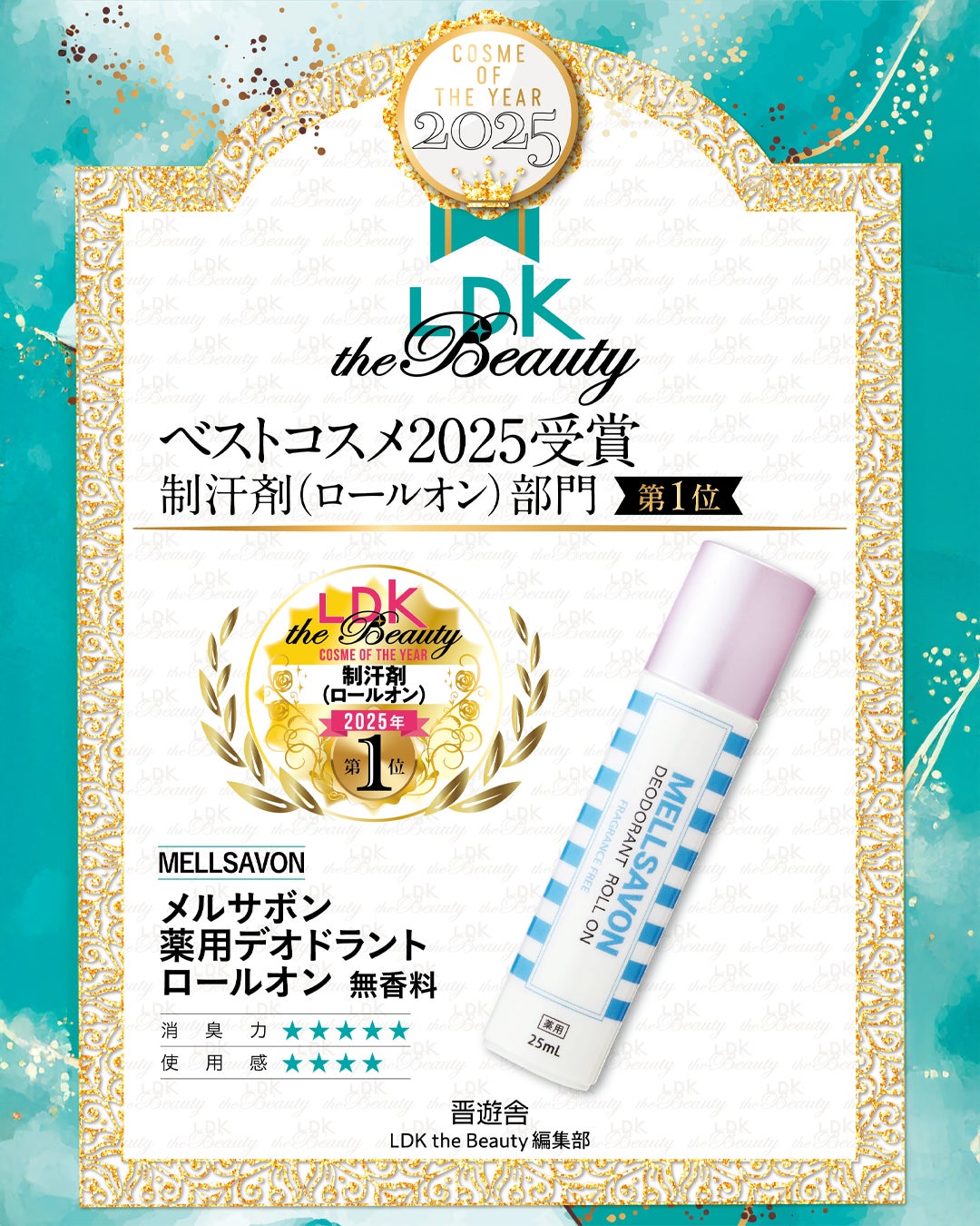株式会社ジャパンゲートウェイ(所在地:東京都中央区 代表:伊藤英信)が展開する、ボディケア ブランドMELLSAVON(メルサボン)が今年の春に発売したワキ臭・汗臭対策の薬用デオドラントシリーズの【メルサボン 薬用デオドラントロールオン 無香料】が、本音のコスメ批評誌で人気の“LDK the Beauty”(株式会社晋遊舎)2026年1月号 ベストコスメ Award 2025 “制汗剤(ロールオン)部門”で、最高ランクのBestを受賞しました。『メルサボン薬用デオドラントロールオン 無香料』は同誌2025年8号の特集“制汗剤部門”で最高ランクのベストバイ&A+評価を受賞、同時期に発売した『メルサボン薬用デオドラントスティック 無香料』はA評価を受賞し、デオドラントシリーズでダブル受賞しています。今回、ベストコスメ Awards 2025の受賞を記念して、メルサボン公式Instagramにてプレゼントキャンペーンも実施いたします。